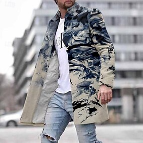 男性用 塗装 マウンテン 川 冬物コート オーバーコート コート ポケット付き カジュアル デイリーウェア バケーション お出かけ プリント フロントポケット 秋冬 折襟 長袖 カーキ色