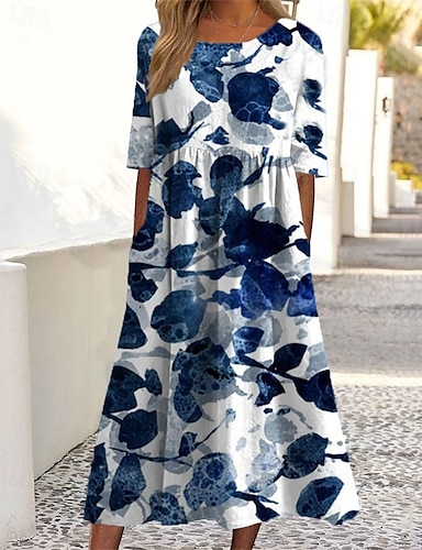 女性用 ミディドレス カジュアルドレス サマードレス ファッション 近代の 日常 ビーチ 週末 レギュラー フラワー 半袖 クルーネック ホワイト ブルー 夏 春