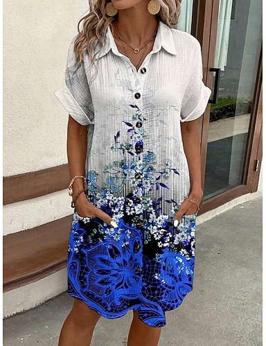 女性用 ミニドレス シャツドレス カジュアルドレス プリントドレス ファッション 近代の 日常 ビーチ 週末 レギュラー フラワー 半袖 シャツカラー ブルー 夏 春 秋