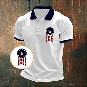 アメリカ独立記念日 男性用 アメリカの米国旗 ポロシャツ ボタンアップポロ ゴルフシャツ 半袖 ポロシャツ ラペル ファッション カジュアル 日常 祭り プリント 夏 ホワイト ルビーレッド ブルー