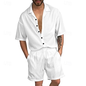男性用 Tシャツスーツ 2 ピースの衣装 ティー&ショーツ 半袖 シャツカラー 夏 平織り ファッション カジュアル 2個 バケーション デイリーウェア お出かけ ホワイト カーキ色 メンズトップTシャツ