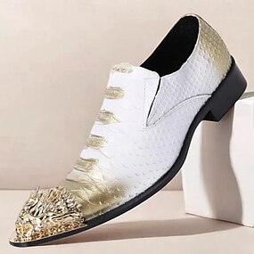 メンズのホワイトとゴールドの本牛革ローファー。スタッズメタルのつま先付き。ナイトライフパーティーやステージパフォーマンスに最適なモダンなパンクスタイルのドレスシューズ。