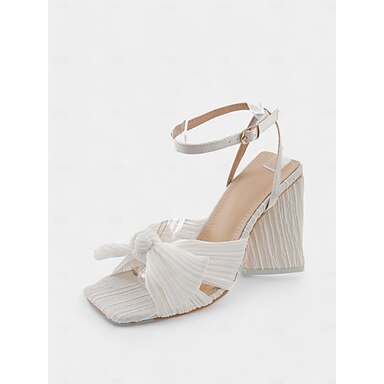 花柄のアンクルストラップが付いた白いサテンのブロックヒールのブライダルサンダル。結婚式や披露宴に最適です。