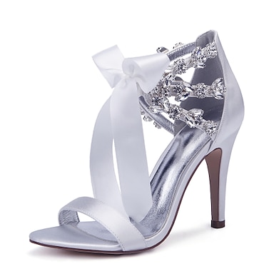 エレガントなホワイトラインストーンとパールのブライダルヒール、女性用 - クリスタル装飾のスティレットヒールとリボンのディテールが特徴のウェディングシューズ