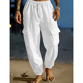 男性用 カーゴパンツ リネンパンツ サマーパンツ ビーチパンツ ドローストリング 弾性ウエスト マルチポケット 平織り 履き心地よい 高通気性 全長 アウトドア 日常 祝日 旅行度假风 ファッション ブラック ホワイト