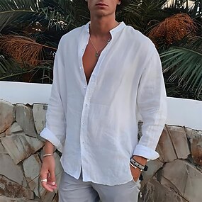 男性用 シャツ バンドカラーシャツ サマーシャツ ビーチウェア ボタンアップシャツ 平織り アウトドア バケーション ブラック ホワイト ブルー グリーン 長袖 折襟 春 & 秋 衣類