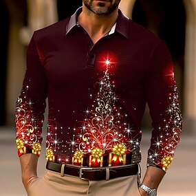 クリスマス メンズ クリスマスツリー 3D ポロツリー カジュアル ゴルフ 長袖 アウトドア カジュアル デイリー ストリートウェア 秋&冬 3D プリント ターンダウン ワイン ブルー ダーク グリーン マイクロ エラスティック ポリエステル