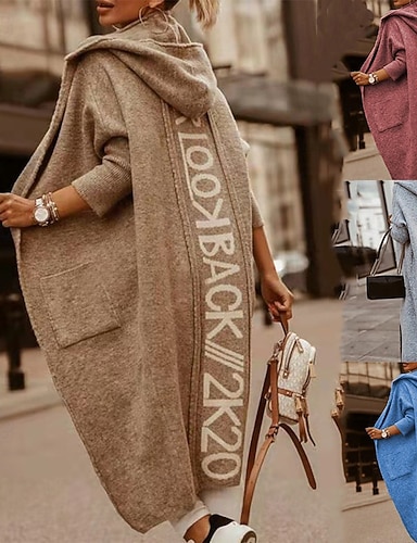 女性用 ニット カーディガン エレガント ファッション ストリートファッション レタード フード付き オープンフロント ポケット ニット プリント 長袖 ロングトップス ニット アウトドア 日常 週末 ピンク カーキ色 春 秋