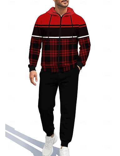 クリスマス 男性用 パーカー トラックスーツ 2ピーストラックスーツ ドローストリング ジッパーを閉める チェック 格子柄 スーツウェア 秋 レッド ボウケーション 屋外 トラベル ライトウェイト ファッション 長袖 スポーツ アクティブウェア 伸縮性あり レギュラー