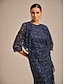 女性用 ブレザー ジャケット ライトウェイト レース 刺繍 スパンコール イリュージョンレース エレガント フラワー フォーマル 記念日 パーティー 結婚式のゲスト オープンフロント ショート クルーネック レギュラー 七分袖 アウターウェア ネイビーブルー 春 秋