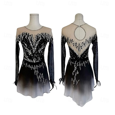 フィギュアスケート ドレス 女性用 女の子 アイススケート ドレス ブラック パッチワーク アシンメトリーヘム メッシュ スパンデックス 高弾性 訓練 競技大会 スケートウェア クラシック クリスタル・ラインストーン 長袖 アイススケート フィギュアスケート
