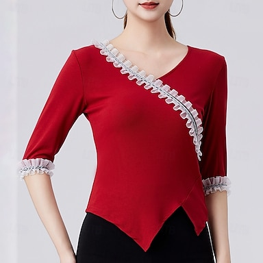 ラテンダンス ボールルームダンス 上着 ラッフル ピュアカラー スプライシング 女性用 性能 訓練 ハーフスリーブ ハイウエスト コットン混