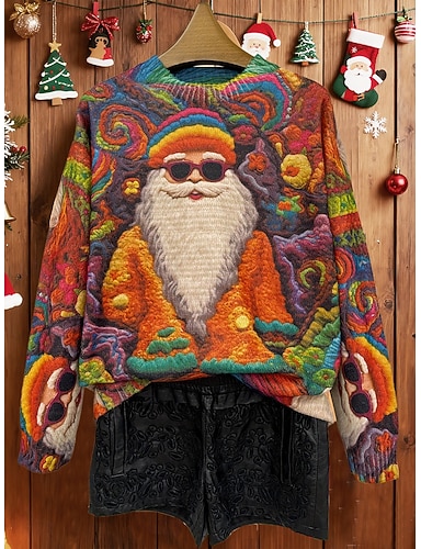 クリスマス レディース セーター プルオーバー デイリー カジュアル グラフィック サンタクロース リブ編み クルーネック ニット プリント 長袖 レギュラー トップス ニット アウトドア 週末 オレンジ 秋 冬