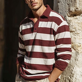 男性用 水平ストリップ ラグビーポロ 長袖 ポロシャツ 襟付きシャツ スポーツウェア カジュアル 学校 アウトドア アスレイジャー 3Dプリント 春 秋 冬 マルーン ブルー グリーン
