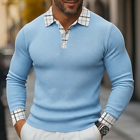 男性用 カラーブロック ワッフルポロシャツ 長袖 ポロシャツ 襟付きシャツ ビジネスカジュアル ビジネス 仕事に着る デイリーウェア 3Dプリント ボタン 春 秋 冬 ブルー1 青3# 青2#