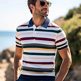 男性用 ボタンアップポロ ゴルフシャツ カジュアル スポーツ ラペル 半袖 ファッション ベーシック 縞柄 パッチワーク ボタン 夏 ネイビーブルー グリーン アプリコット ボタンアップポロ