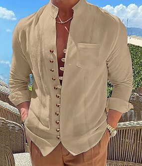 男性用 シャツ リネンシャツ グアヤベラシャツ サマーシャツ カジュアルシャツ ボタンアップシャツ 平織り バケーション キュリーズ ブラック ホワイト ピンク カーキ色 長袖 Band Collar 夏 春 & 秋 衣類