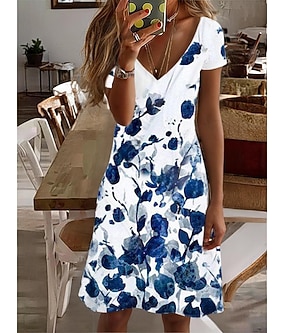 女性用 ミディドレス シフトドレス サマードレス 旅行度假风 カジュアル 日常 レギュラー フラワー グラフィック 抽象的 ハーフスリーブ クルーネック ホワイト ブルー スカイブルー ライトグレー 夏 春