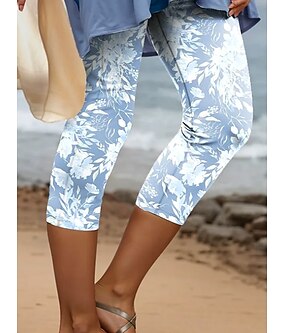 ウィメンズ レギンズ カプリパンツ ハイエラスティシティ バケーション ハワイアン ひざ丈 ミッド ウエスト フローラル グラフィック プリント 通気性 柔らかい バケーション カジュアル ホリデー ライトブルー 夏 春 レギュラーフィット
