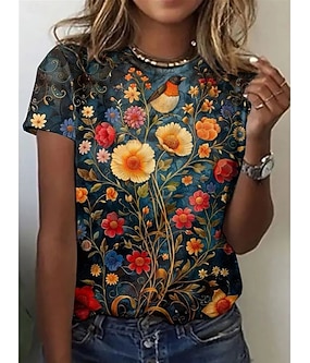 女性用 Tシャツ フラワー カジュアル 半袖 ラウンドネック レギュラートップス 日常 プリント ブルー グリーン 夏