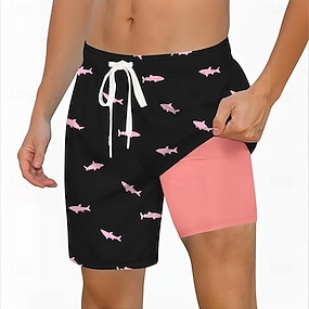 男性用 鮫 海洋生物 裏地付きショートパンツ 2 in 1 スイムショーツ スイムショーツ ミディアムウエスト ハワイアン バケーション 祝日 ビーチウェア サイドポケット コンプレッションライナー付き 伸縮性のあるドローストリングウエスト デザイナー 衣類