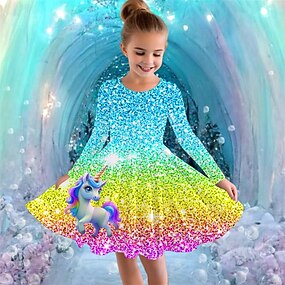 女子 3D 虹色 ユニコーン ドレス 長袖 3Dプリント 秋 冬 バケーション スポーツ 日常 かわいいスタイル カジュアル 美しい 子供 3〜12年 カジュアルドレス A ラインドレス 膝上 レギュラー