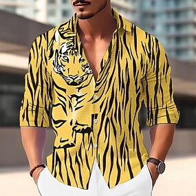 男性用 動物 虎 シャツ ボタンアップシャツ 長袖 ファッション ストリートファッション デザイナー アウトドア カジュアル 日常 秋 冬 折襟 プリント イエロー ピンク ブルー スカイブルー パープル