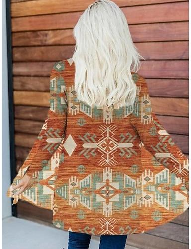 女性用 冬物コート トレンチコート ライトウェイト 快適 プリント オープンフロント ヴィンテージ ファッション カジュアル ボヘミアンヴィンテージ 幾何学模様 バケーション カジュアル ロング ノーカラー レギュラー 長袖 アウターウェア ブルー ブラウン グリーン 春 秋