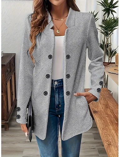 女性用 ブレザー 快適 高通気性 ボタン カジュアル 平織り オフィス ストリート カジュアル デイリーウェア シングルブレスト ロング スタンド レギュラー 長袖 アウターウェア ブラック ホワイト グレー 春 秋