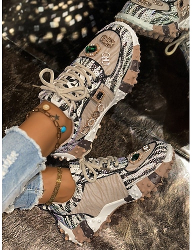 カラフルなデザインとロゴのディテールが特徴の女性用ラインストーン装飾チャンキースニーカー。ファッション、ナイトライフ、パーティーの装いにぴったり。