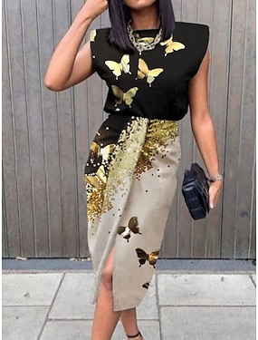女性用 マキシドレス ラップドレス ボディコンドレス セミフォーマルドレス オフィス レギュラー オンブル' グラフィック バタフライ ノースリーブ クルーネック ブラック ゴールド グレー 夏