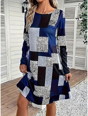 女性用 ミニドレス シースドレス A ラインドレス フィット&フレアドレス パーティー カジュアル ボヘミアン パーティー 結婚式のゲスト 日常 レギュラー グラフィック 幾何学模様 チェック 長袖 クルーネック ブルー パープル グリーン グレー 春 秋 冬