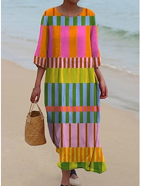ウィメンズ マキシドレス カフタン 3/4丈袖 クルーネック カジュアル シフトドレス Aラインドレス ボヘミアン デイリーホリデー 外出 ジオメトリック ピンク グリーン 春 秋