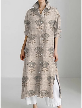 女性用 ミディドレス シャツドレス カジュアルドレス ファッション 近代の 日常 祝日 週末 レギュラー フラワー グラフィック 七分袖 シャツカラー ピンク カーキ色 グレー 夏 春 秋
