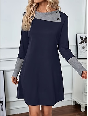 女性用 ミニドレス プリントドレス ファッション 近代の 日常 お出かけ 週末 ルーズフィット カラーブロック 長袖 クルーネック ブラック ネイビーブルー 春 秋