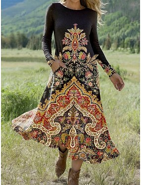 ウィメンズマキシドレス ヴィンテージボヘミアン Aラインドレス クルーネック ロングスリーブ カジュアル デイリー レギュラーフィット グラフィック 幾何学 ブラック レッド オレンジ 春 秋 冬