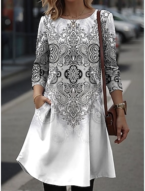 女性用 ミディドレス マキシドレス シースドレス シフトドレス パーティー カジュアル ボヘミアン パーティー 結婚式のゲスト 日常 レギュラー グラフィック ペーズリー トライバル 長袖 クルーネック ブラック ブラウン 春 秋 冬
