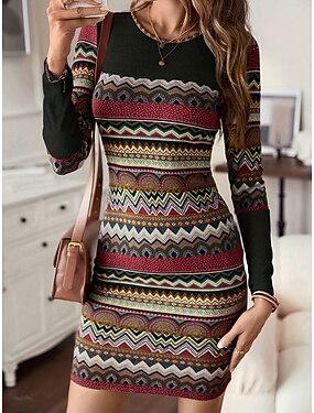 女性用 ひざ丈ドレス ボディコン T シャツドレス シフトドレス 旅行度假风 カジュアル 祝日 デート スリムフィット グラフィック 幾何学模様 長袖 クルーネック ルビーレッド 春 秋 冬