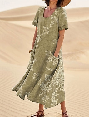 女性用マキシドレス カジュアルドレス カジュアル バケーション ルーズフィット フローラル グラフィック リネンライク 3/4丈スリーブ クルーネック グリーン 春 秋 冬