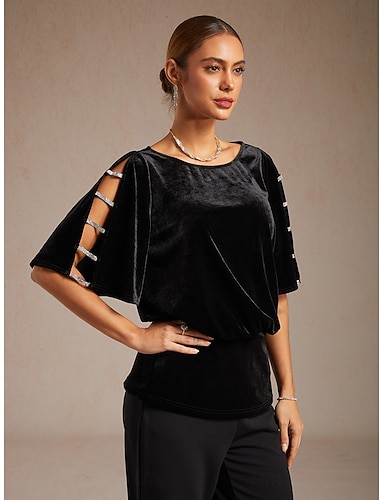 女性用 ベルベット ドレッシーなトップス エレガント パーティー ハーフスリーブ クルーネック 冷たい肩 ロングトップス パーティーイブニングウェア パーティー ビーズ 切り抜き ブラック 春、夏、秋、冬