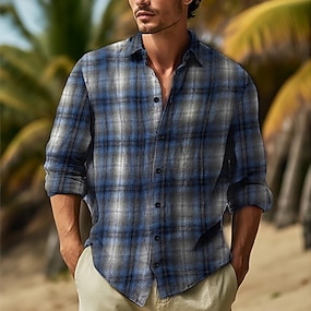 男性用 シャツ カジュアルシャツ チェックシャツ ボタンアップシャツ イエロー ワイン ブルー 長袖 チェック ラペル バケーション 日常 衣類 ファッション カジュアル