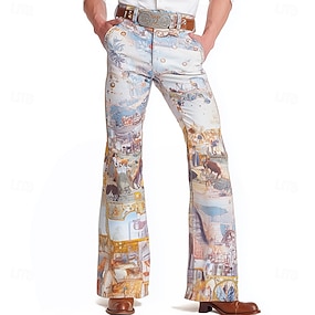 男性用 古典的なイラスト ディスコパンツ 60年代 70年代 ベルボトム ミディアムウエスト 西洋料理 ヴィンテージレトロ アウトドア バケーション カジュアル サイドポケット フレアレッグパンツ 春 秋 3Dプリント ホワイト