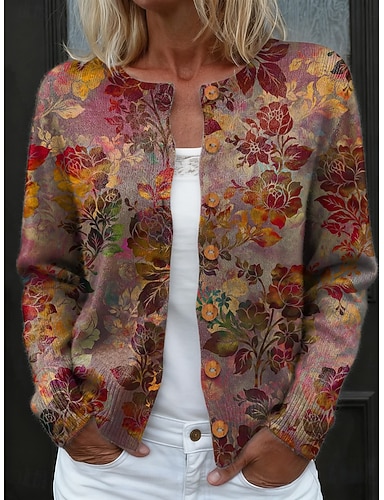 女性用 カーディガン 日常 カジュアル フラワー グラフィック リブ クルーネック 花柄 ボタン プリント 長袖 レギュラートップス ニット アウトドア 週末 ブラウン 春 秋