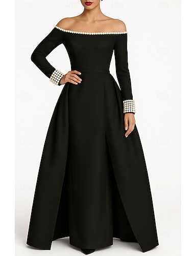 Aライン イブニングドレス エレガント フォーマルドレス フォーマル 結婚式 フロア丈 七分袖 オフショルダー ポケット ストレッチサテン とともに フリル 2025