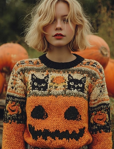 レディースセーター ヴィンテージセーター プルオーバー デイリーカジュアル アニマル パンプキン リブ編み クルーネック ニットプリント 長袖 レギュラートップス ニット アウトドア ハロウィン オレンジ 秋 冬