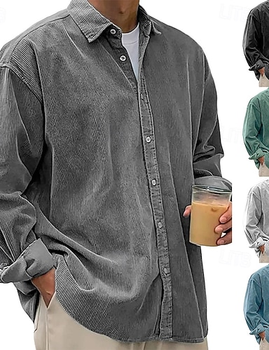 男性用 シャツ カジュアルシャツ コーデュロイシャツ ボタンアップシャツ ブラック カーキ色 アーミーグリーン グレー 長袖 純色 折襟 アウトドア ストリート 衣類 ヴィンテージ カジュアル