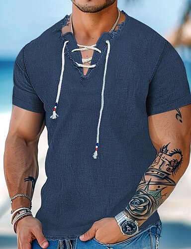 男性用 シャツ シャンブレーシャツ カリコシャツ サマーシャツ デニムシャツ ネイビーブルー ダークブルー ライトブルー 半袖 純色 スタンドカラー カジュアル 日常 ドローストリング 衣類 ファッション カジュアル 高通気性 快適