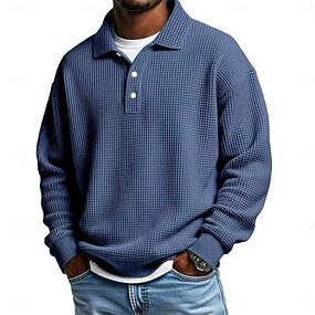 男性用 ワッフルポロシャツ ポロシャツ フォーマル ビジネス リブ付きポロカラー 長袖 ファッション 純色 ボタン 平織り 秋 春 & 秋 ルーズフィット ブラック ライトグリーン グリーン ライトブルー パープル カーキ色 ワッフルポロシャツ