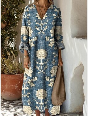 女性用 マキシドレス シースドレス T シャツドレス 旅行度假风 カジュアル ボヘミアン 祝日 デート レギュラー フラワー グラフィック 幾何学模様 長袖 クルーネック ダークブルー 春 秋 冬