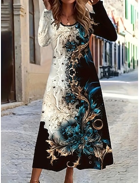 女性用 ロングドレス マキシドレス カジュアルドレス プリントドレス エレガント ファッション 近代の アウトドア 日常 お出かけ レギュラー グラフィック 長袖 クルーネック ルビーレッド ブルー オレンジ ブラウン 春 秋